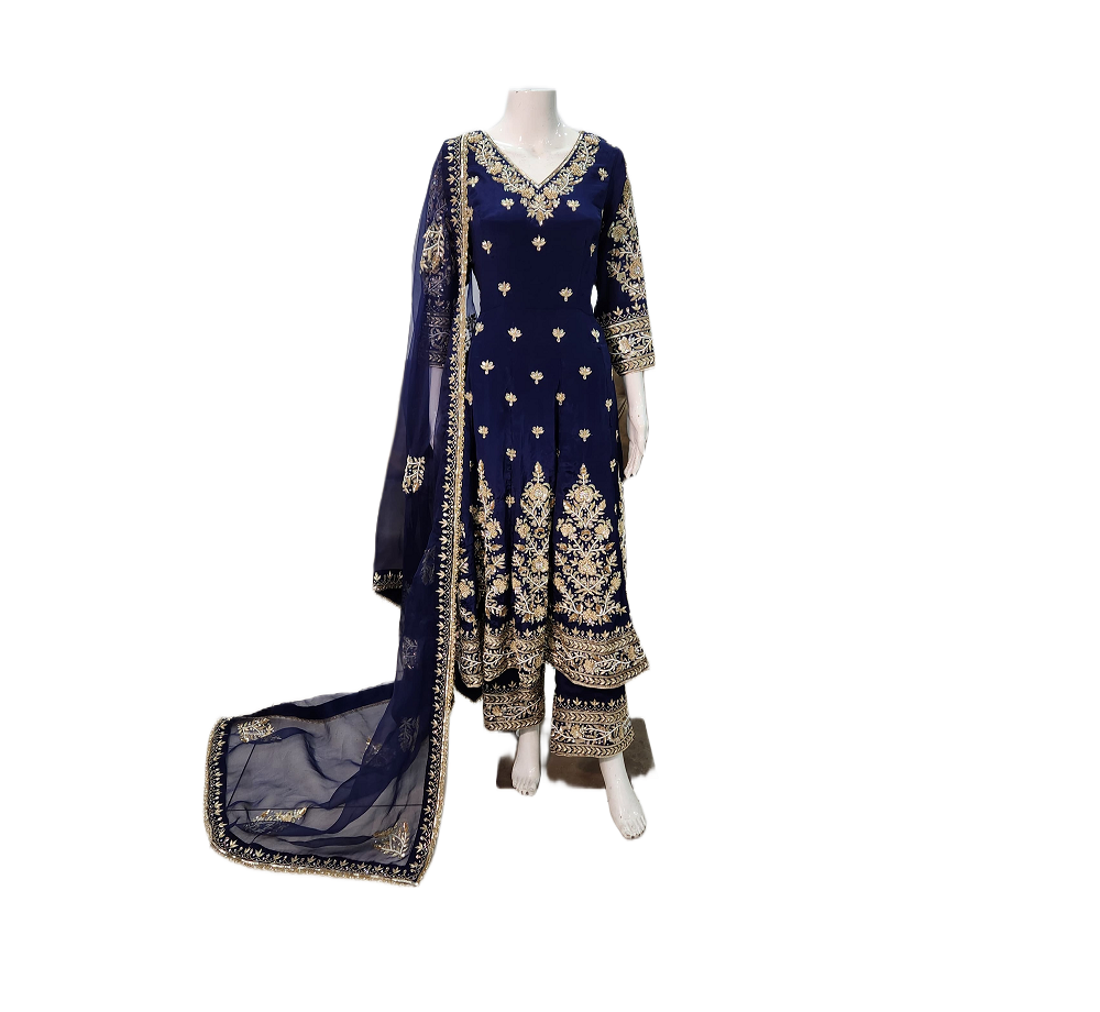 A premium blue sharara with elegant patterns, ideal for weddings and formal events.