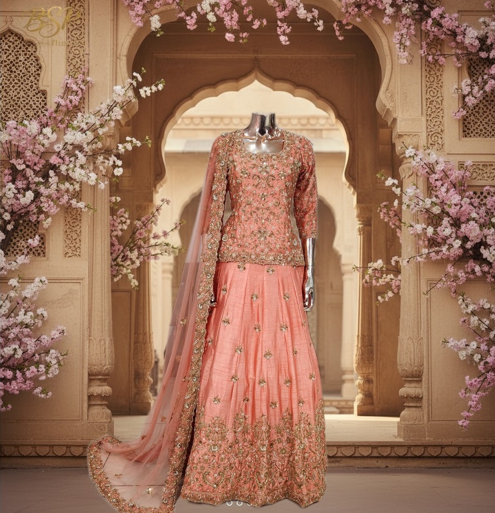 A designer kesari lehnga with a modern cut and luxurious fabric, perfect for special occasions.